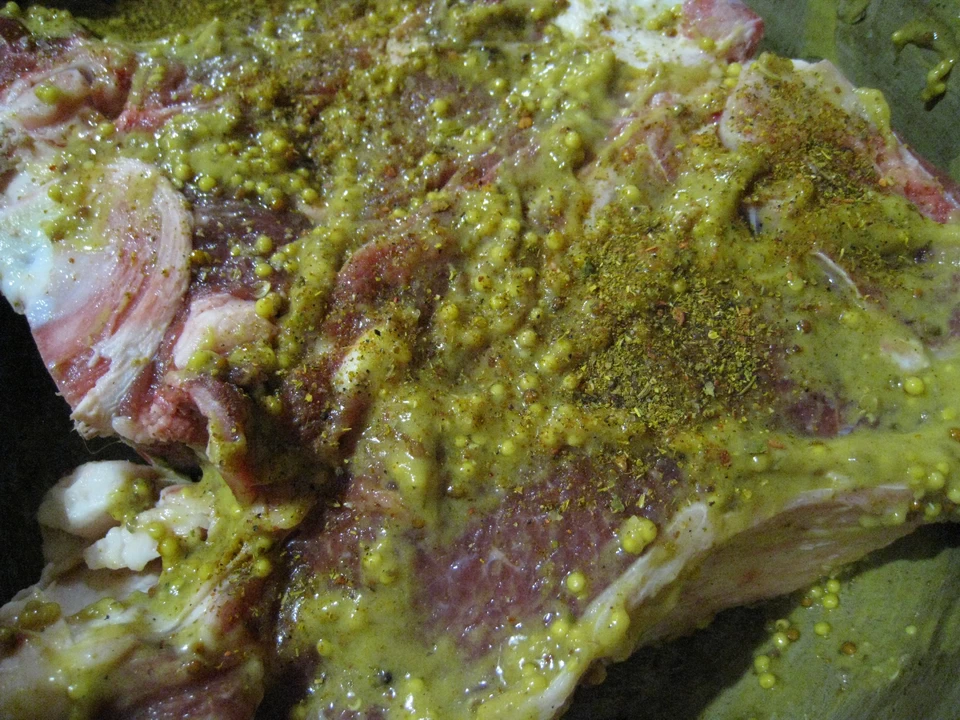 - Солим, перчим, чеснок (раздавить), мускатный орех, можно сухие пряности по вкусу (базилик, имбирь и пр. к мясу), все по щепотке небольшой, обмазываем горчицей (готовой) видимым слоем и оставляем для пропитки не менее, чем на час;