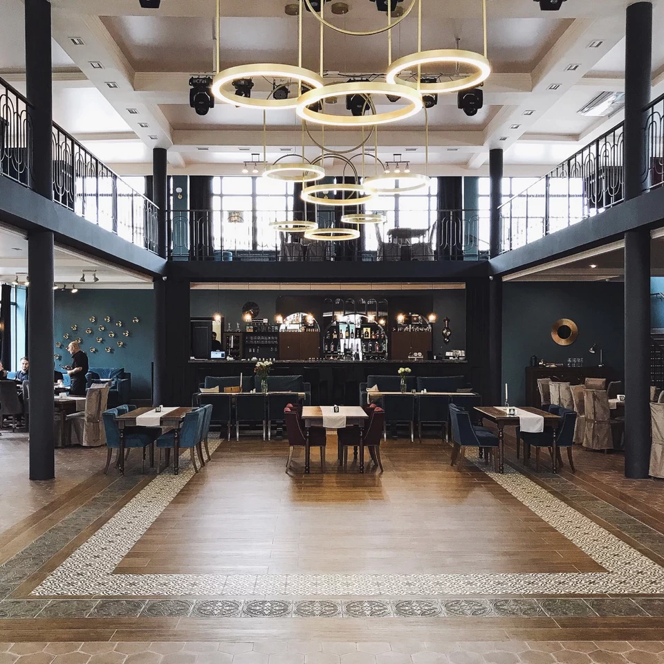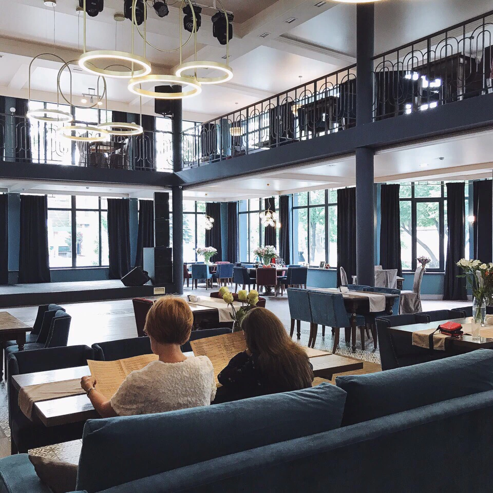 С виду небольшое вновь отстроенное здание внутри оказалось очень просторным и воздушным, чему способствовали большие витринные окна и свободное пространство в центре, со вторым этажом по периметру. Помещение выдержано в сдержанных темно-синих тонах, настраивающих на расслабление и уютную атмосферу у огня камина в гостиной. Только тут вместо камина – барная стойка. Стилистически помещение показалось несколько эклектичным, но без навязчивости. Из «национального колорита» лишь подобие орнамента на керамическом полу.
