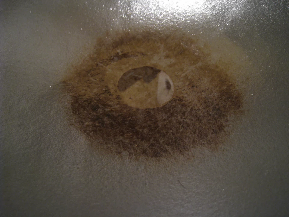 После отмывки на днище осталось небольшое коричневатое пятно. Пока не понял точно, но скорей всего, это остатки подгоревших шкварок. Отдраивать их силой пока не решился, боясь за эмаль.