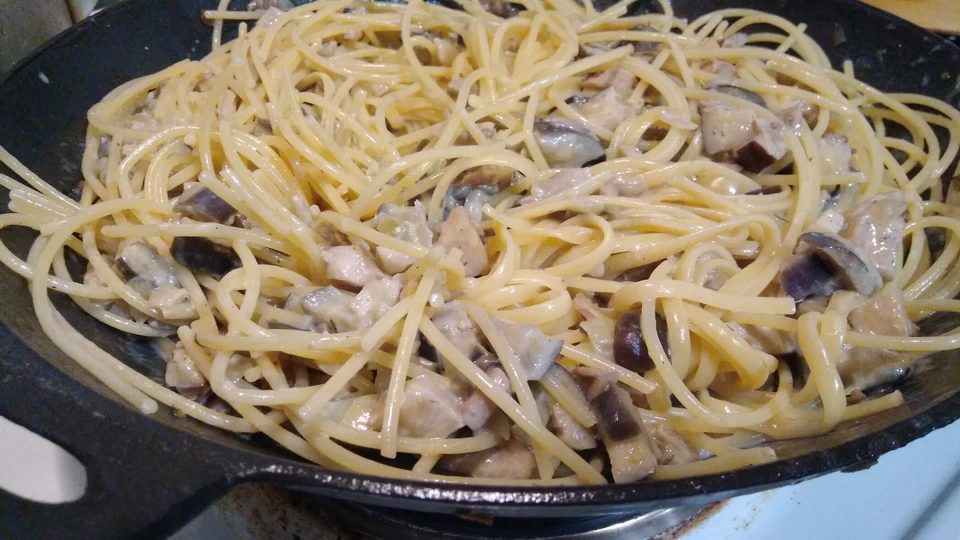 Для первого блина использовал жаренную картошку. Проблема моей электроплиты в недостаточном жаре. То есть всегда стоит дилемма: жарить на максимуме, но частями, либо сразу, но тогда выйдет немного подтушивать. Из-за недостатка жара, картошка на дне немного прилипла, но не критически. Тем более, простительно для первого использования посуды. Со временем масляный слой создаст то, ради чего поются дифирамбы чугунной посуде.